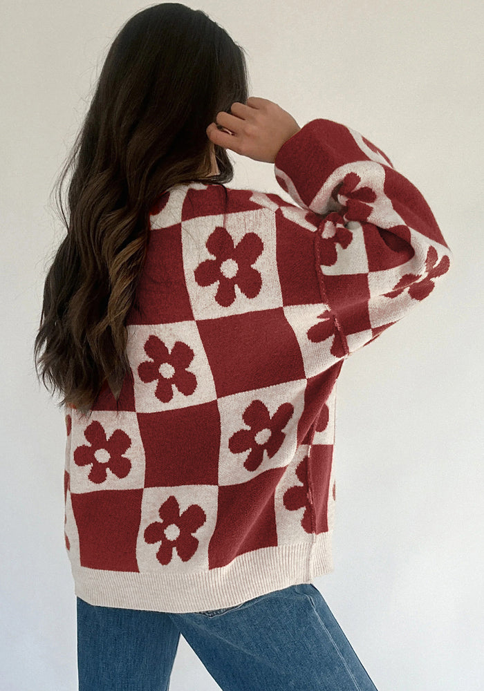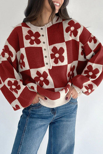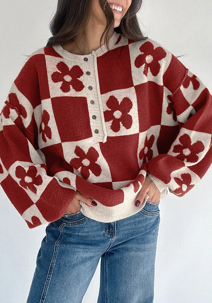 Red Dahlia Flower Plaid Henley Baggy Sweater