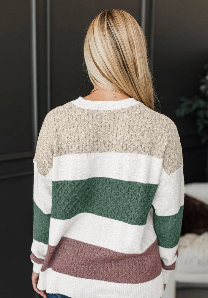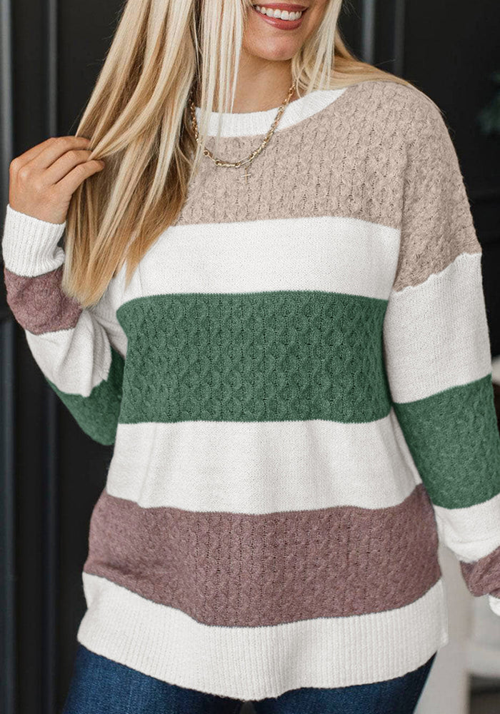 Green Mixed Texture Knit Striped Color Block Loose Sweater