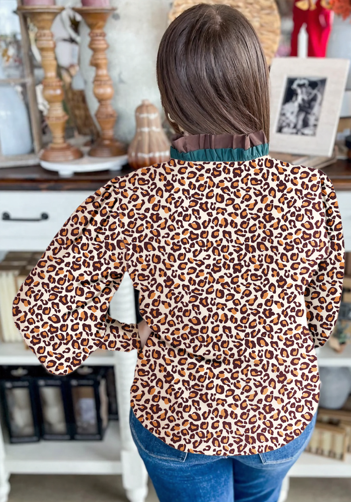 Brown Leopard Print Contrast Frilled Trim Button Down V Neck Shirt