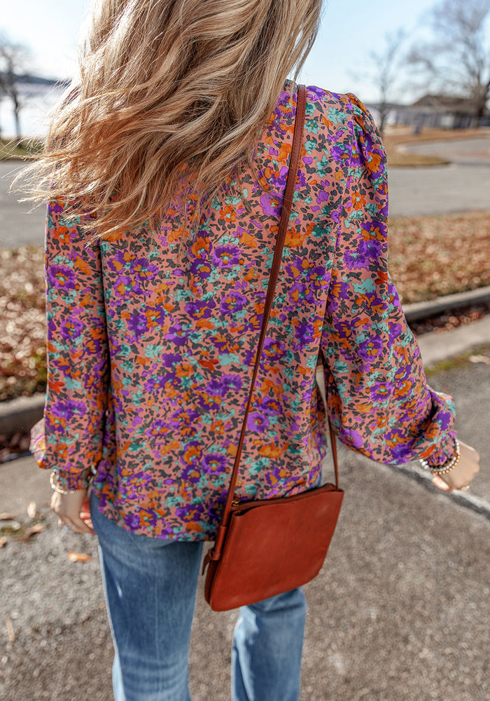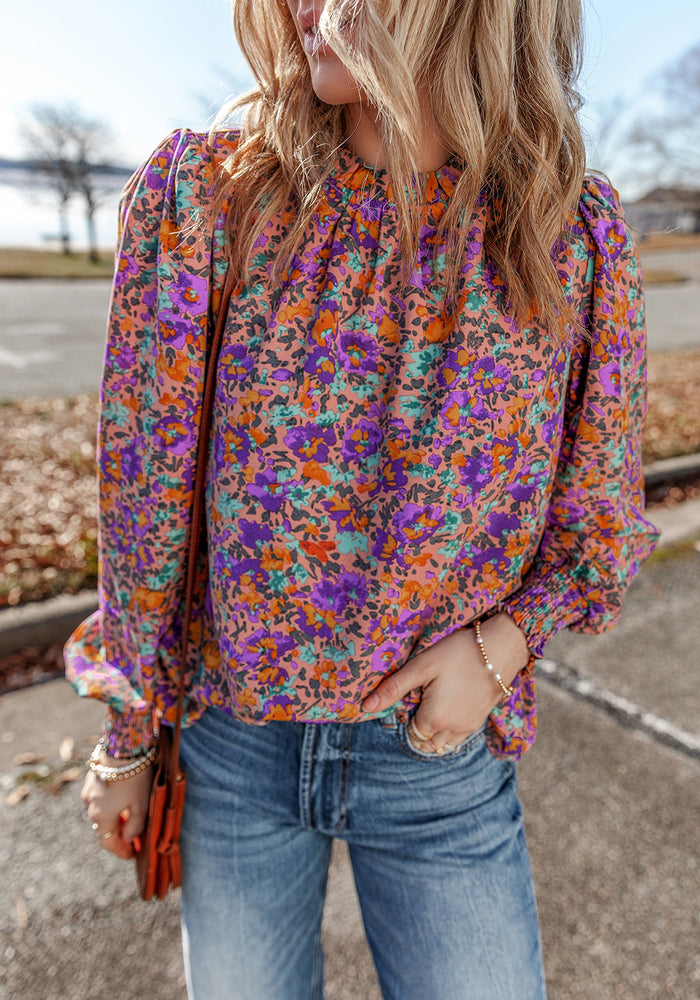 Purple Floral Allover Print Shirred Cuff Frilled O Neck Blouse