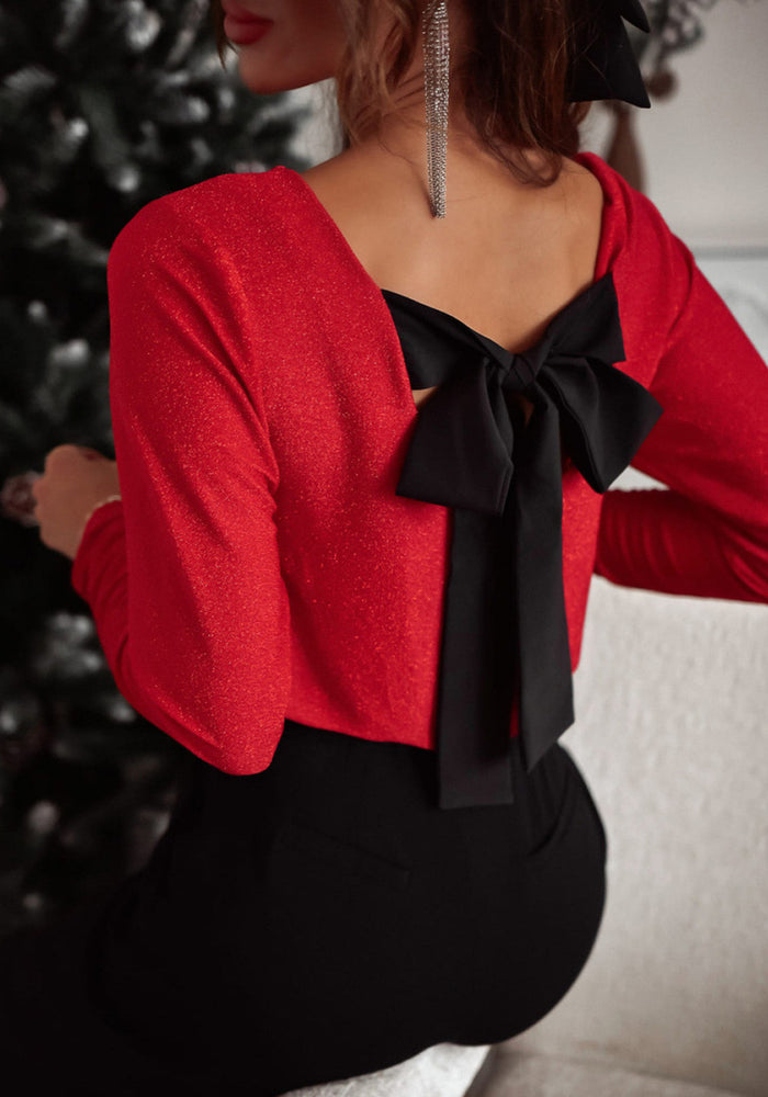 Racing Red Metallic Bowknot Open Back V Neck Top