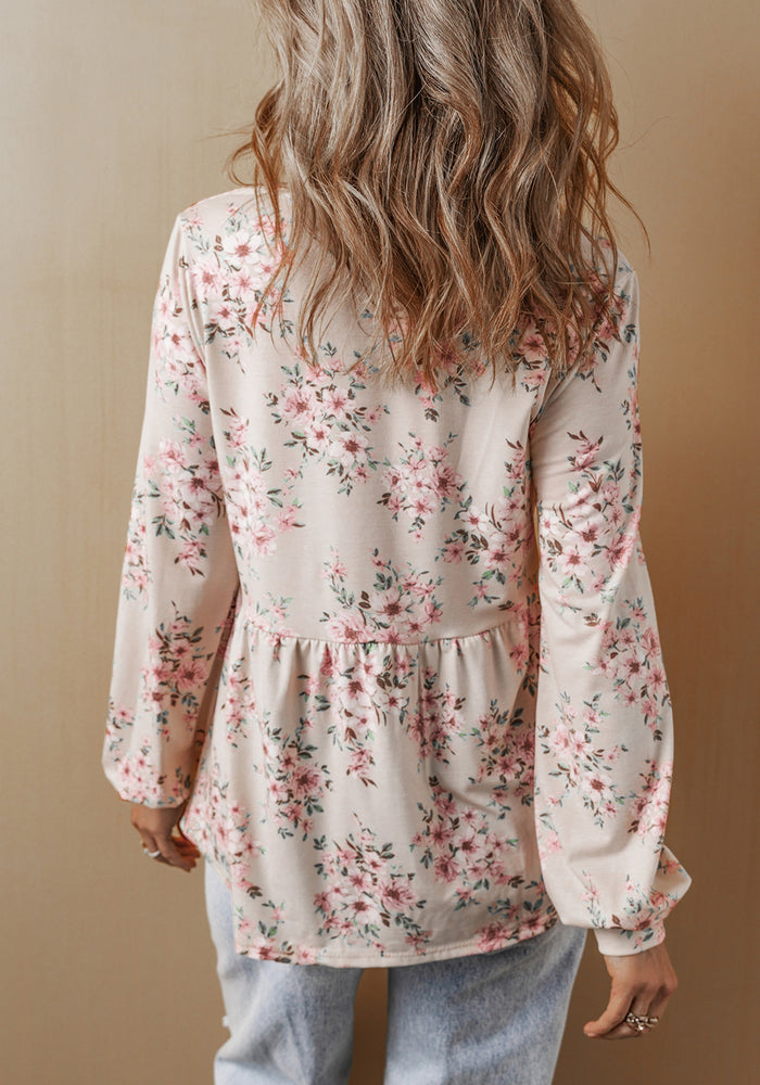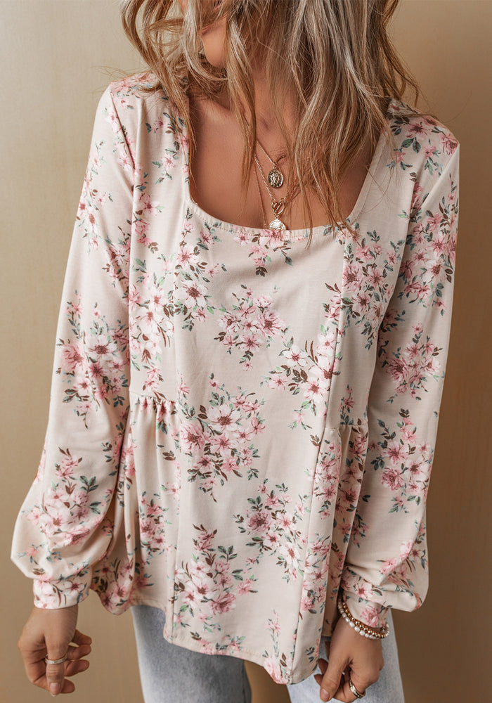 Pink Floral Print Pleated U Neck Loose Fit Blouse