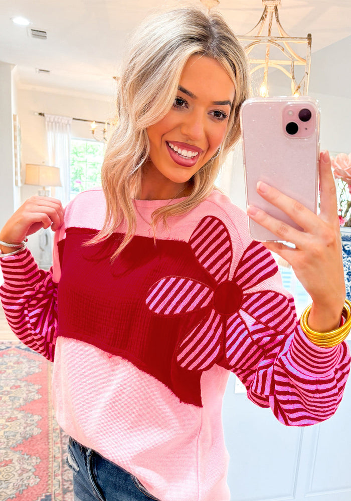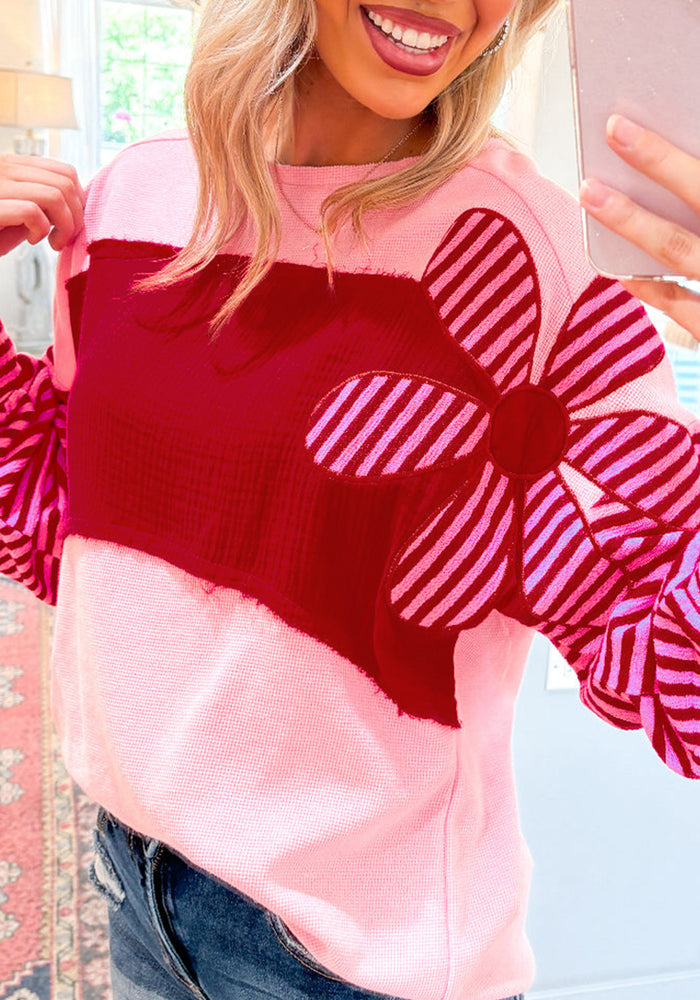 Pink Floral Patch Color Block Striped Sleeve Textured Top