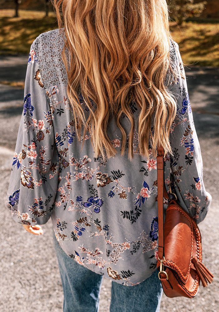 Sky Blue Floral Print Lace Patchwork Knot Front V Neck Blouse