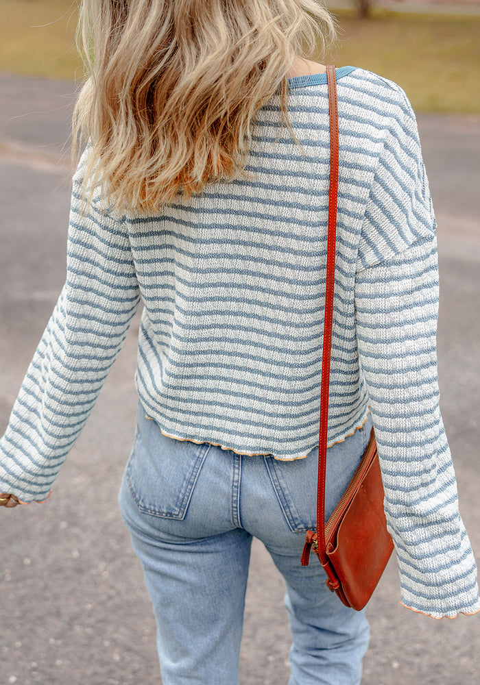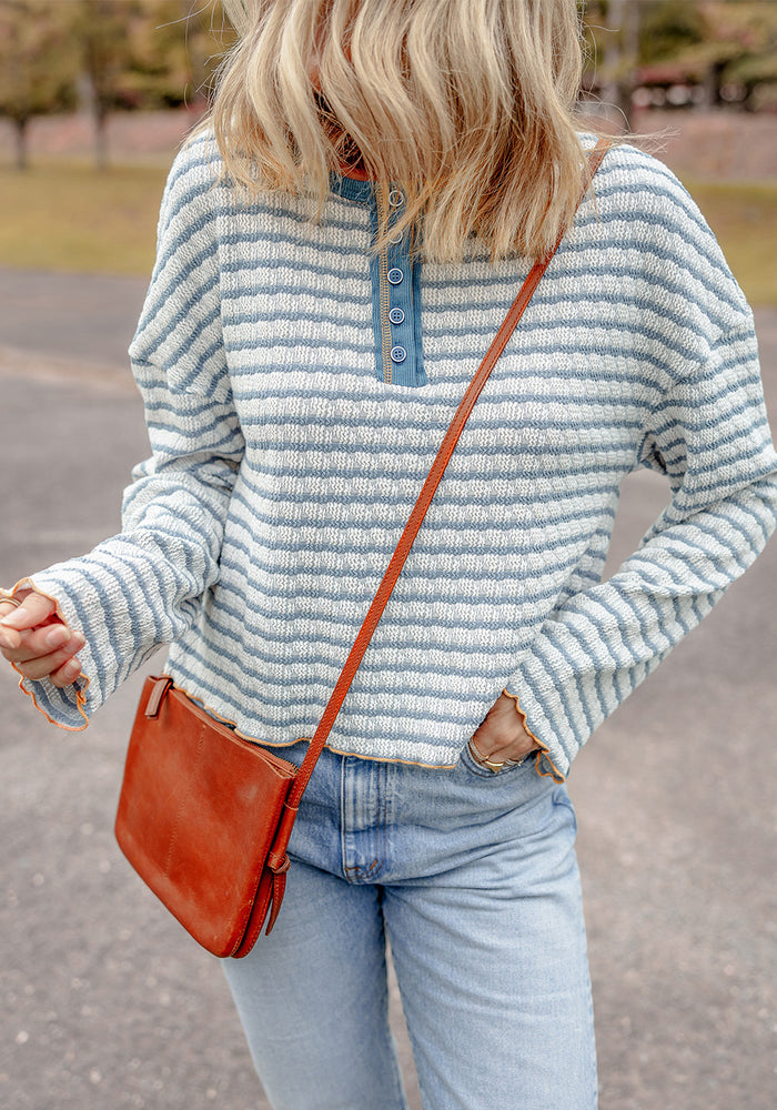 Sky Blue Stripe Textured Frilly Trim Buttons Henley Long Sleeve Top