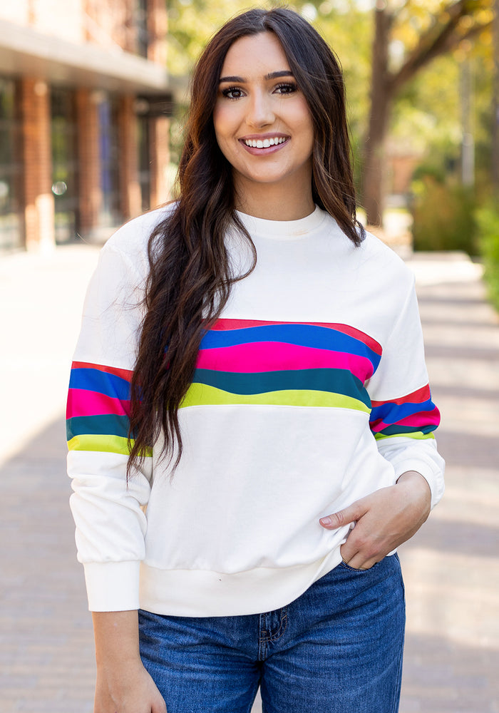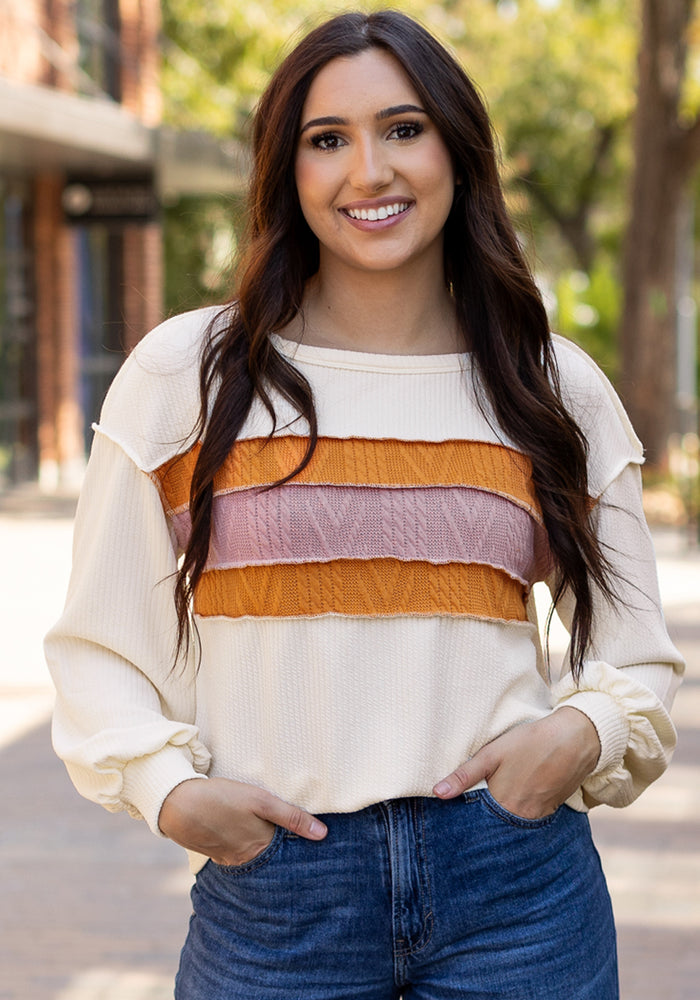 White Corded Exposed Seam Knit Patchwork Drop Sleeve Top