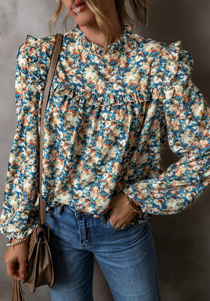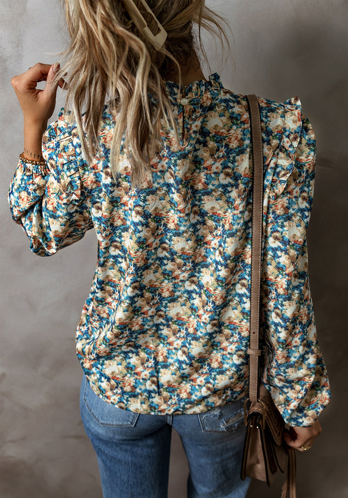 Sky Blue Floral Print Frilled Mock Neck Puff Sleeve Blouse