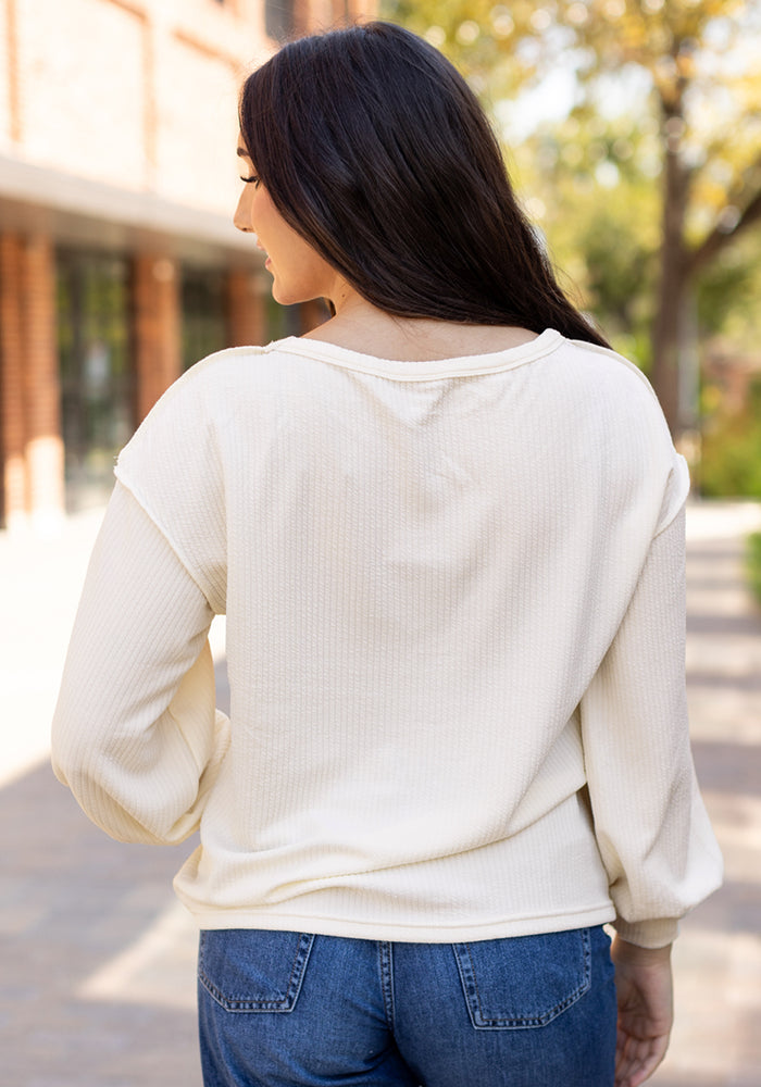 Beige Exposed Seam Textured Knit V Neck Pullover Top