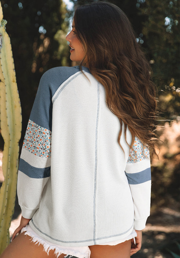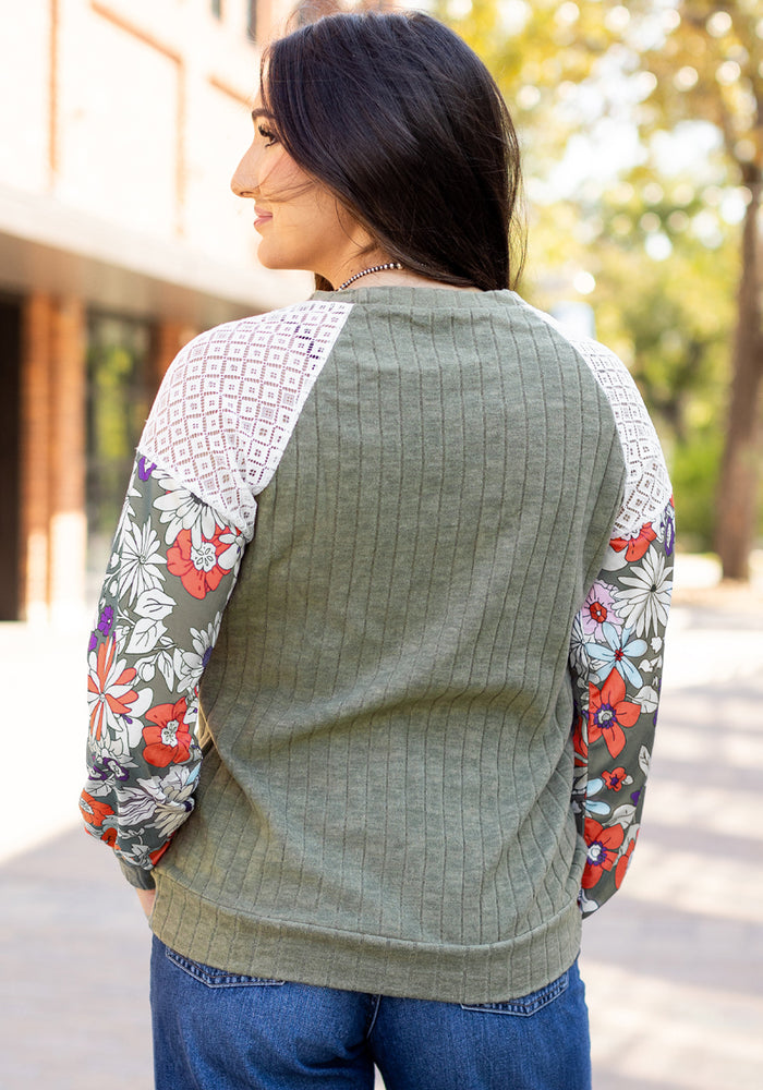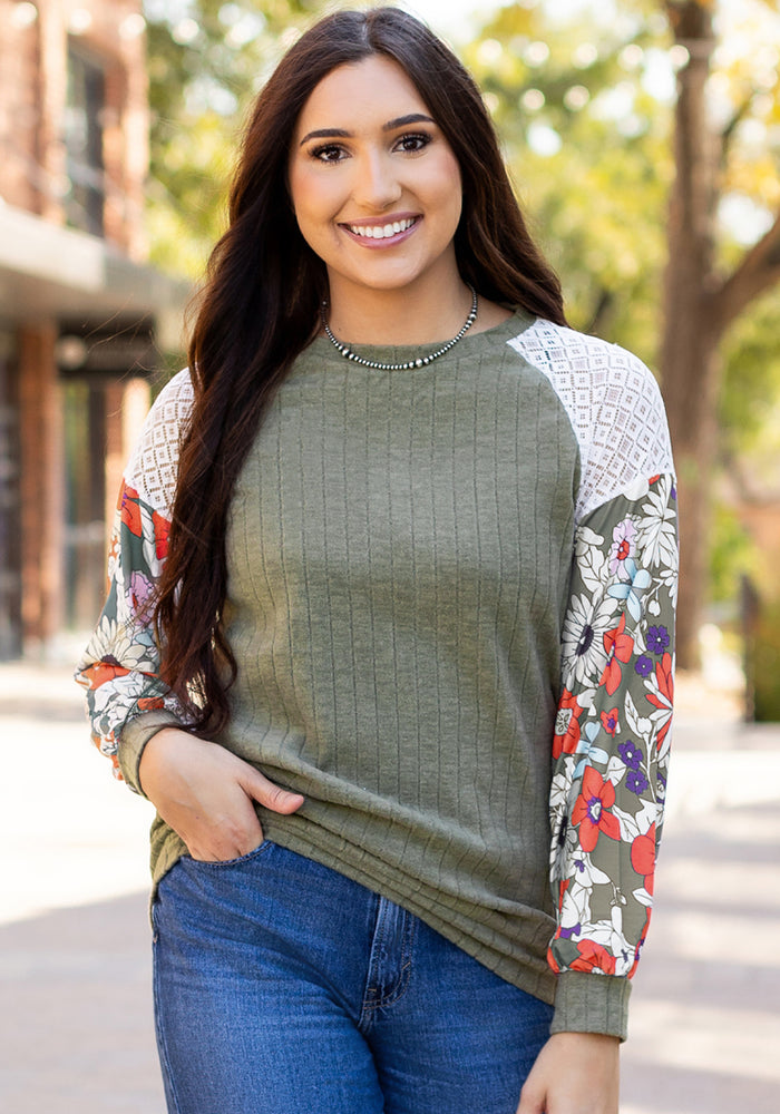 Laurel Green Floral Patchwork Long Sleeve Ribbed Blouse