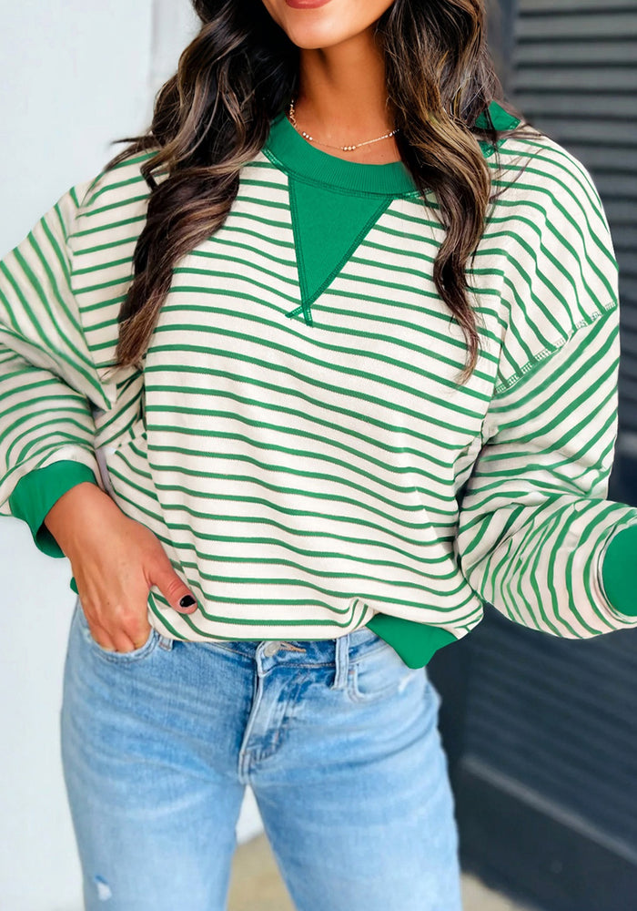 Bright Green Striped Exposed Seam Patchwork Loose Pullover Top