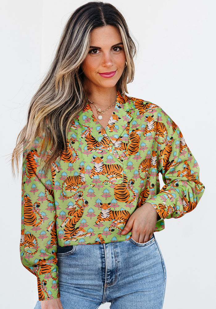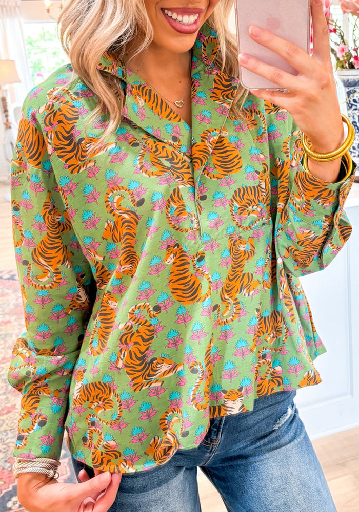 Green Tiger Floral Printed Collared V Neck Casual Shirt