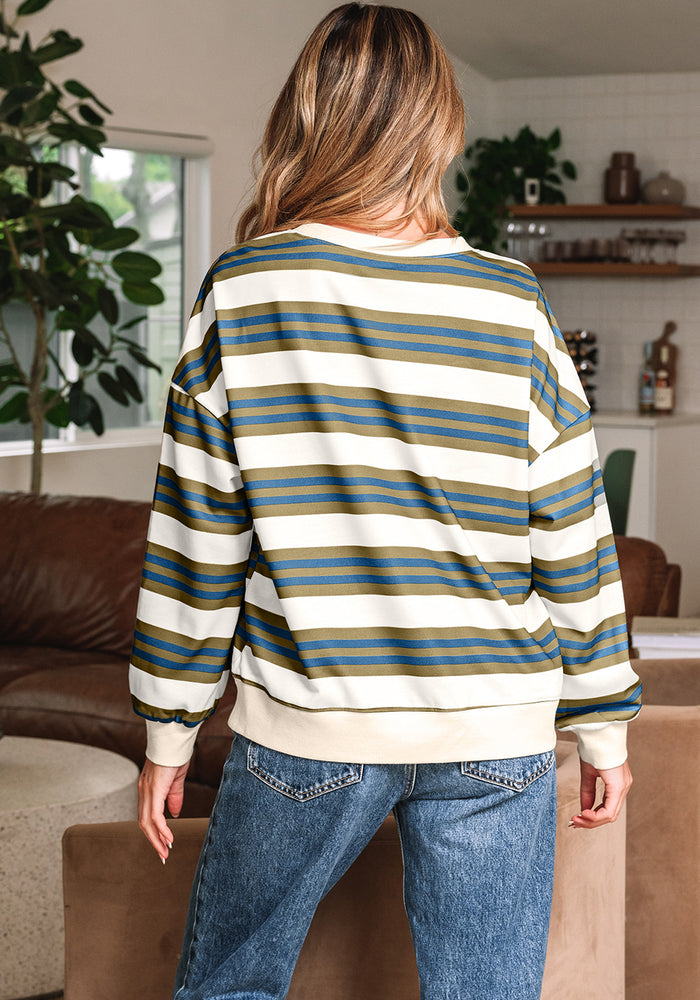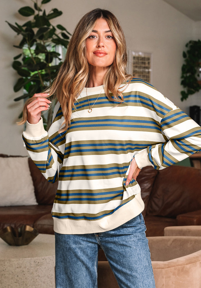Khaki Stripe Crew Neck Drop Shoulder Pullover Sweatshirt