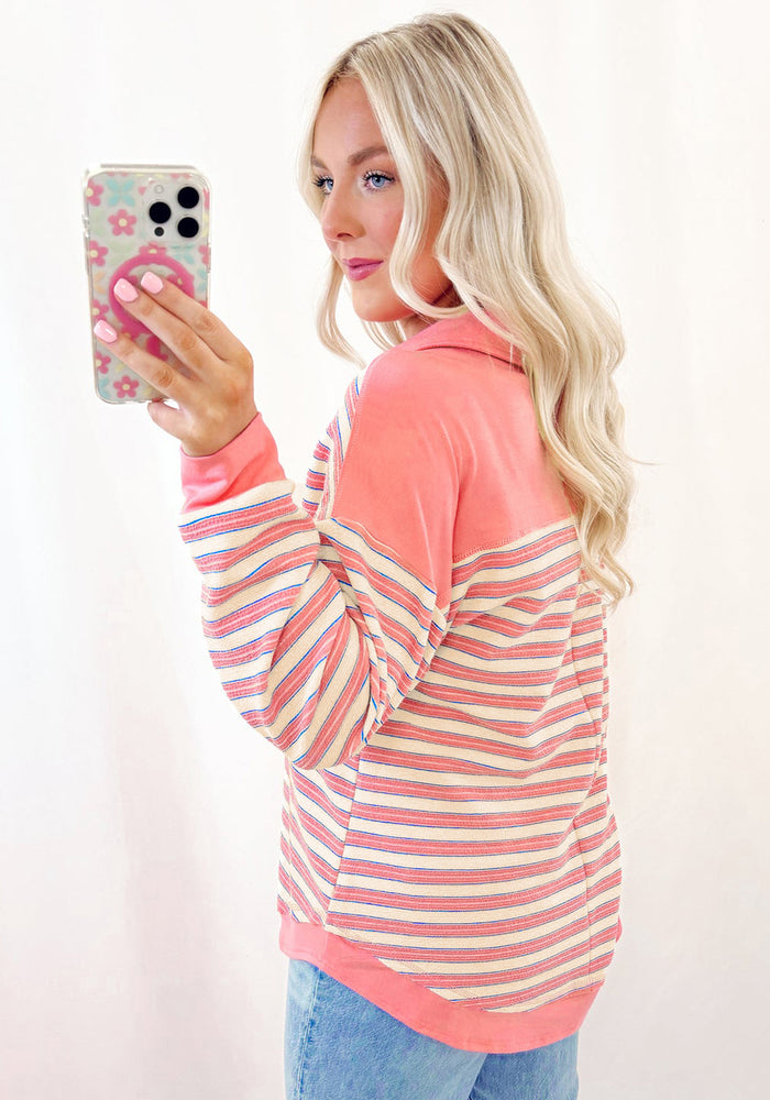 Pink Stripe Buttoned V Neck Collared Drop Shoulder Top