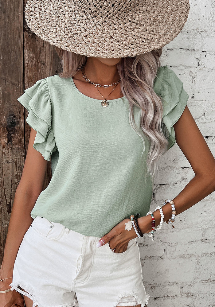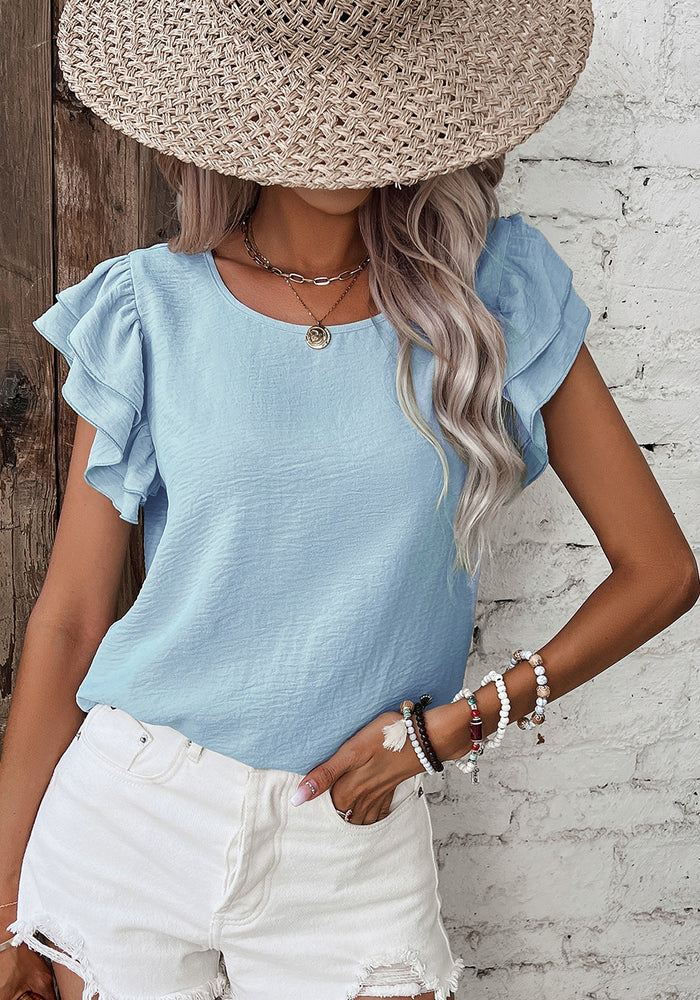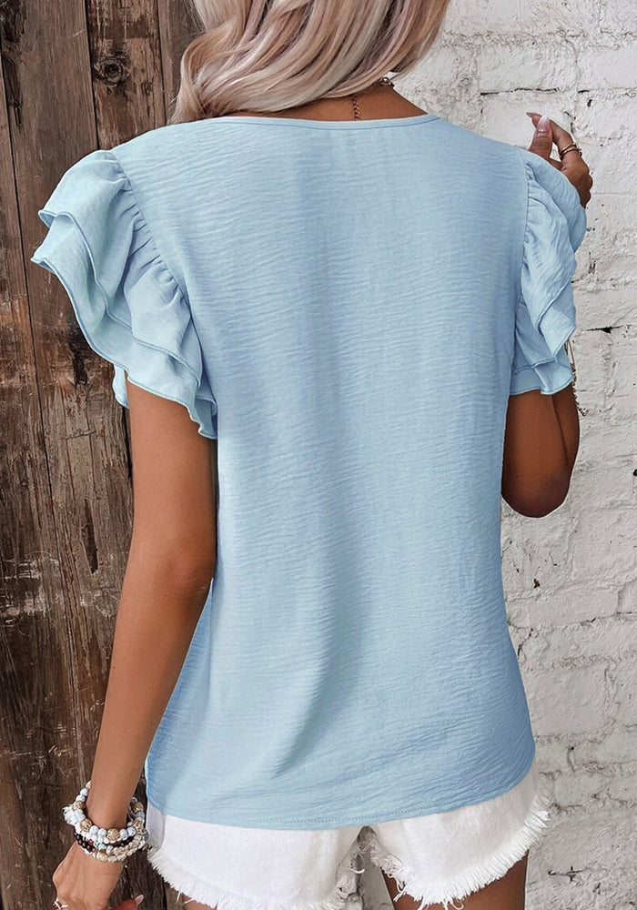 Mist Blue Solid Color Ruffled Short Sleeve Casual Blouse