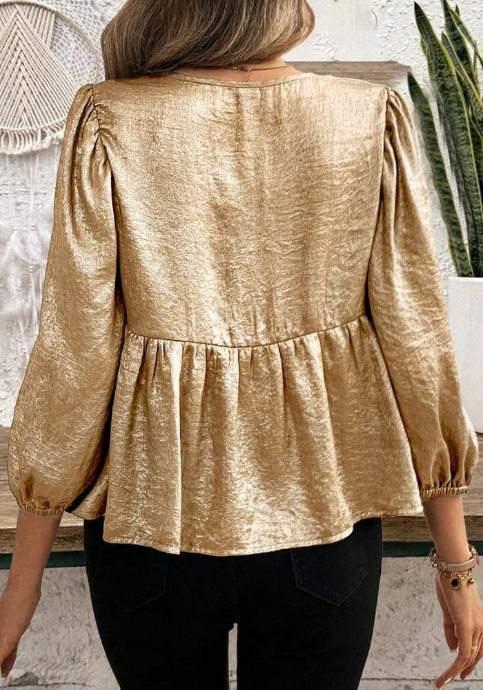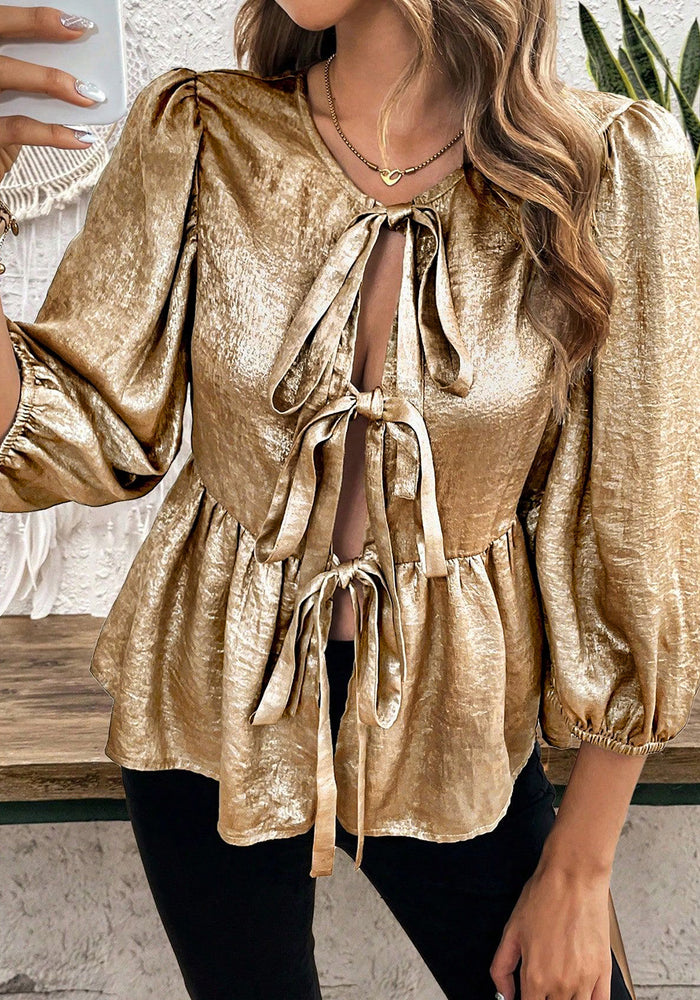 Gold Bow Tie Front Puff 3/4 Sleeve Ruffle Hem Blouse