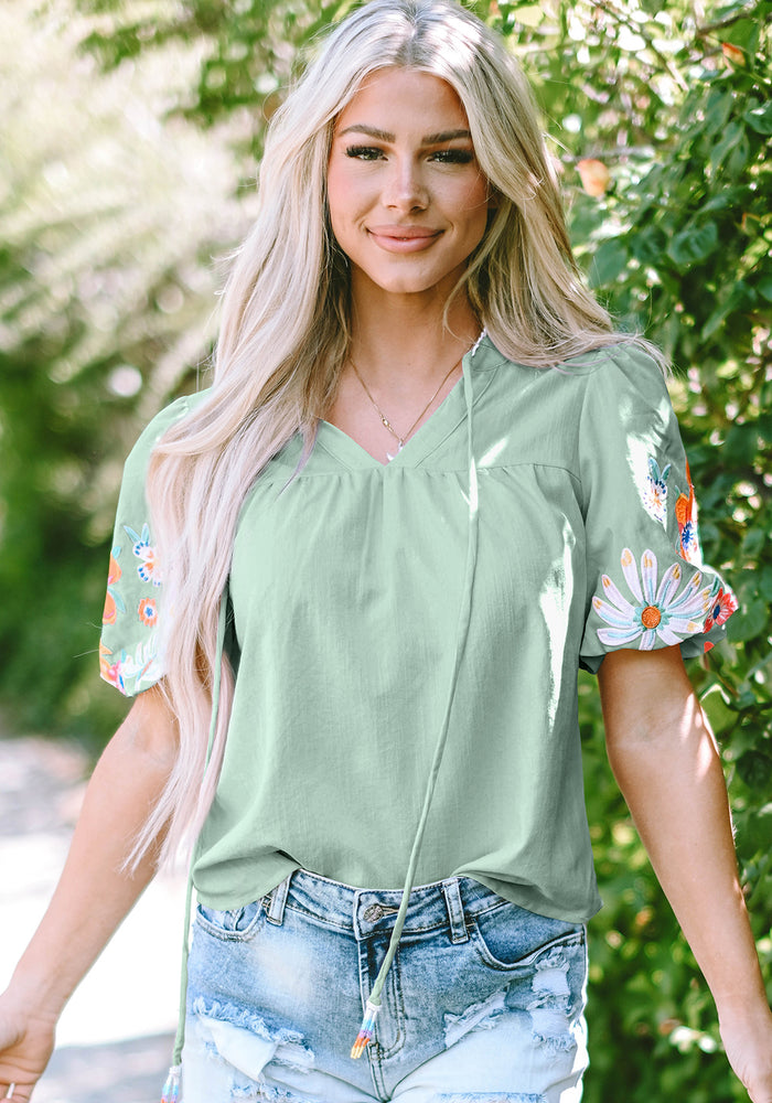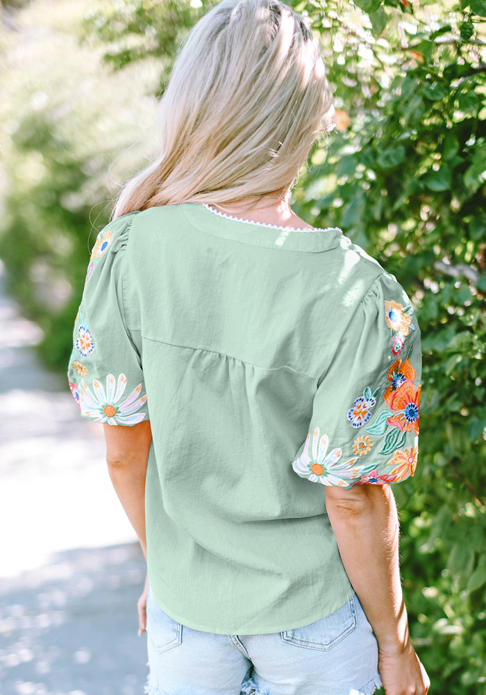 Clearly Aqua Floral Embroidered Puff Sleeve Split Neck Blouse