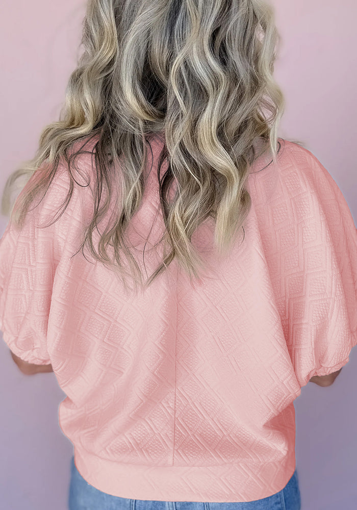 Light Pink Contrast Striped Collar Patchwork Textured Half Sleeve Blouse