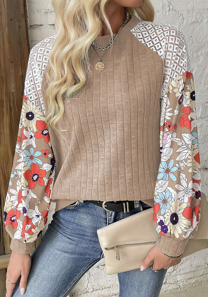 Parchment Floral Patchwork Long Sleeve Ribbed Blouse