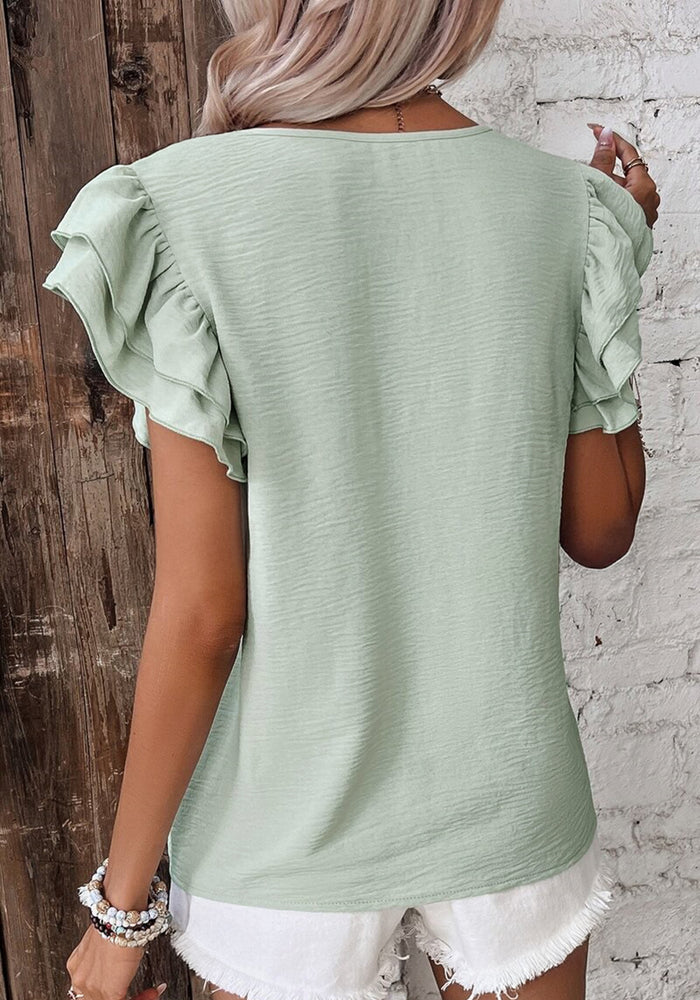 Clearly Aqua Solid Color Ruffled Short Sleeve Casual Blouse