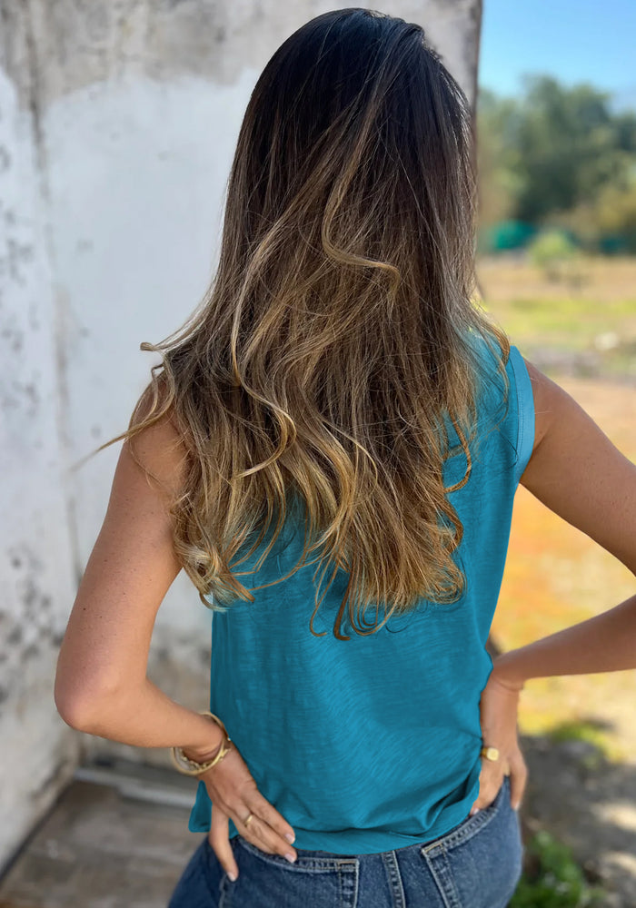 Peacock Blue Metallic Sheen Edge Scoop Neck Tank Top