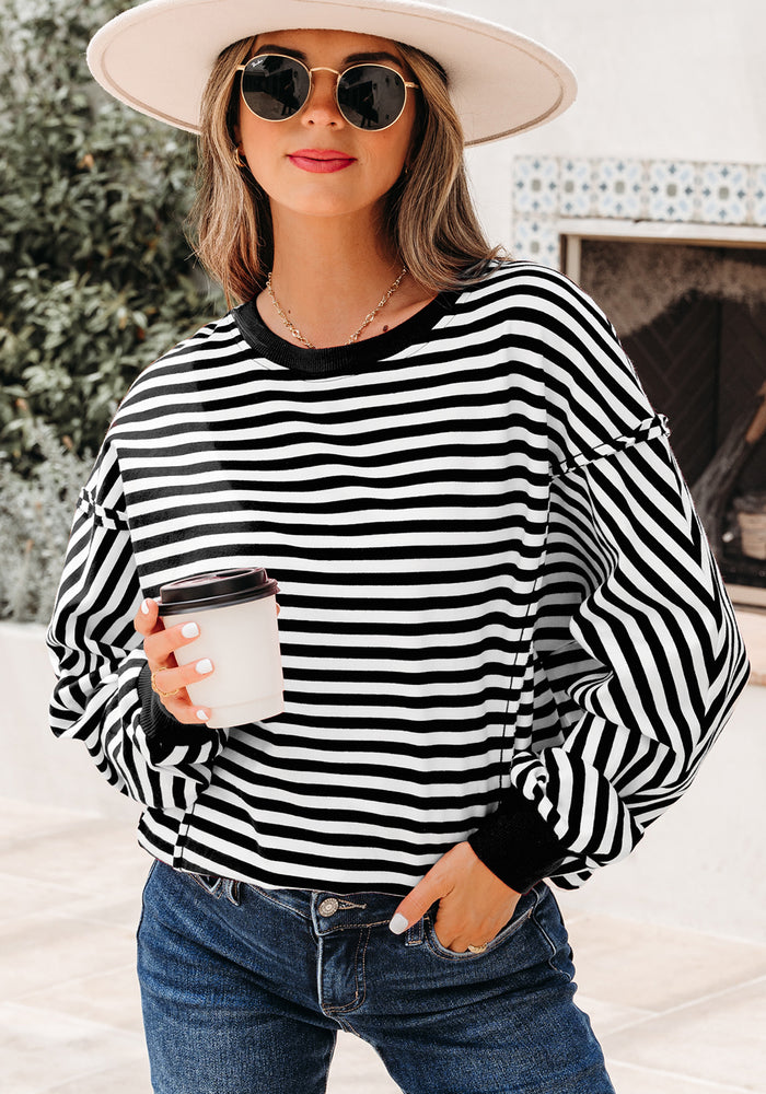 Black Stripe Exposed Seam Drop Shoulder Casual Pullover Top