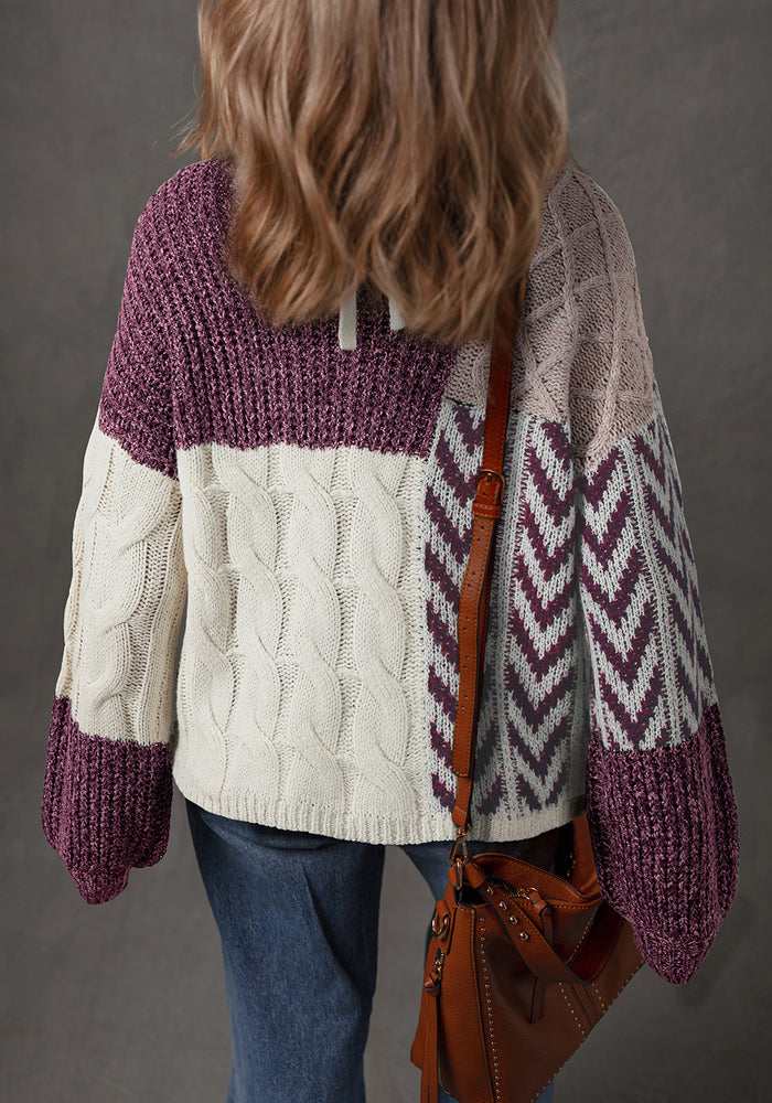Purple Color Block Patchwork Knotted Back Loose Fit Sweater