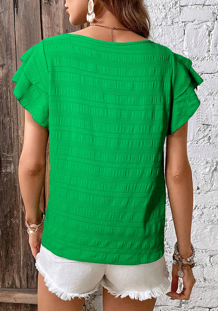 Dark Green Textured Ruffled Sleeve Round Neck Top