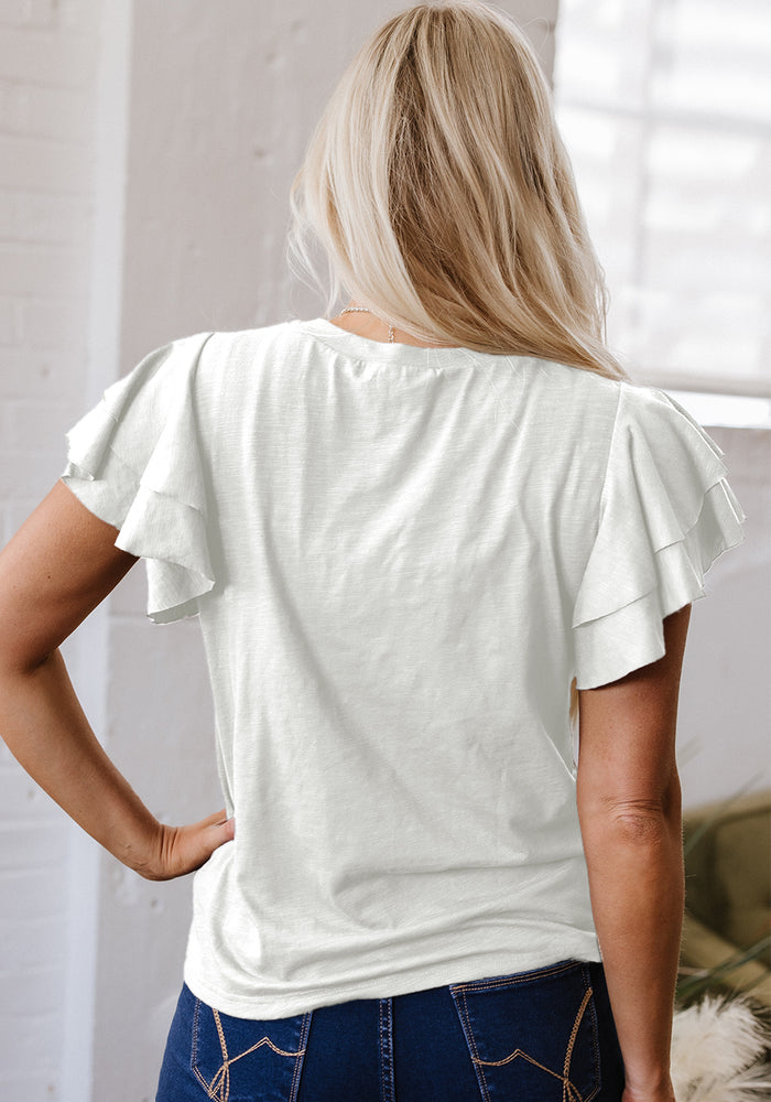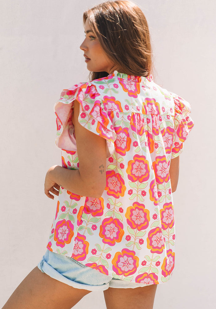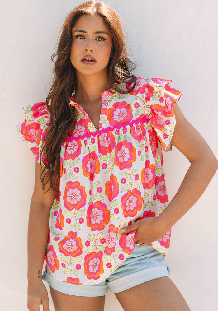 Rose Floral Ruffled Sleeve Ric-rac Trim Split Neck Loose Blouse