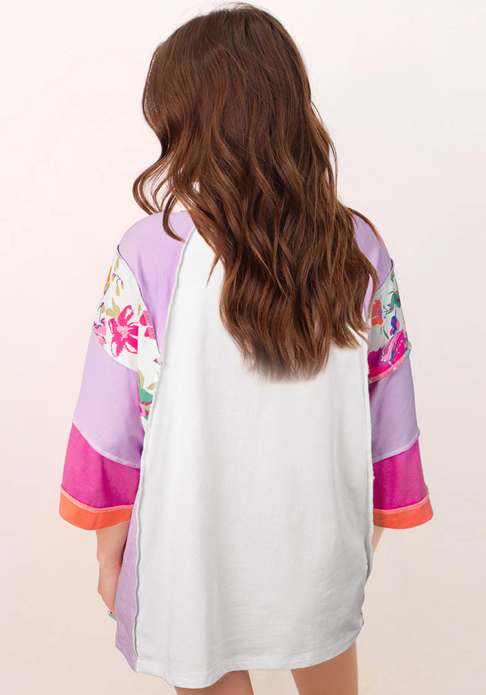 Sachet Pink Floral Color Block Patchwork 3/4 Sleeve Casual Blouse
