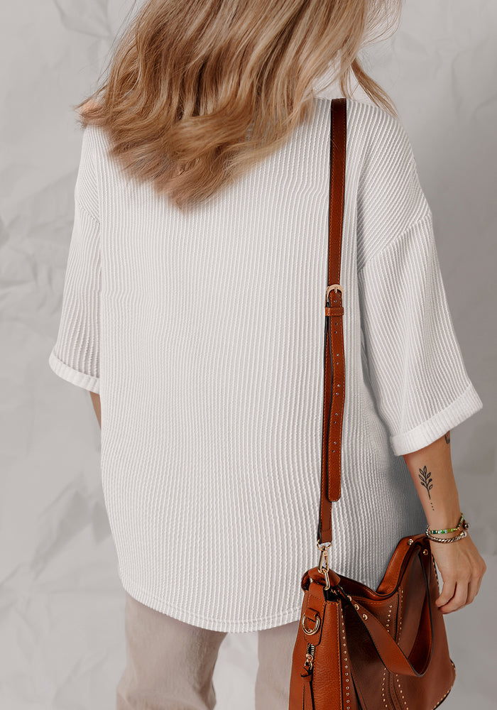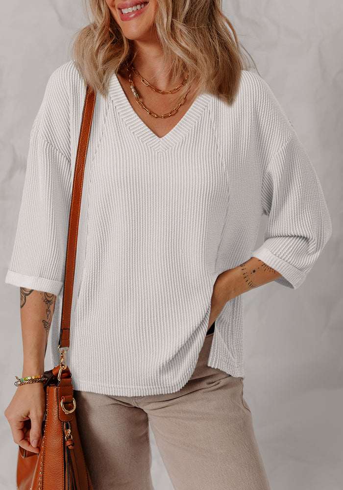 White Solid Color Corded Drop Shoulder 3/4 Sleeve V Neck Top