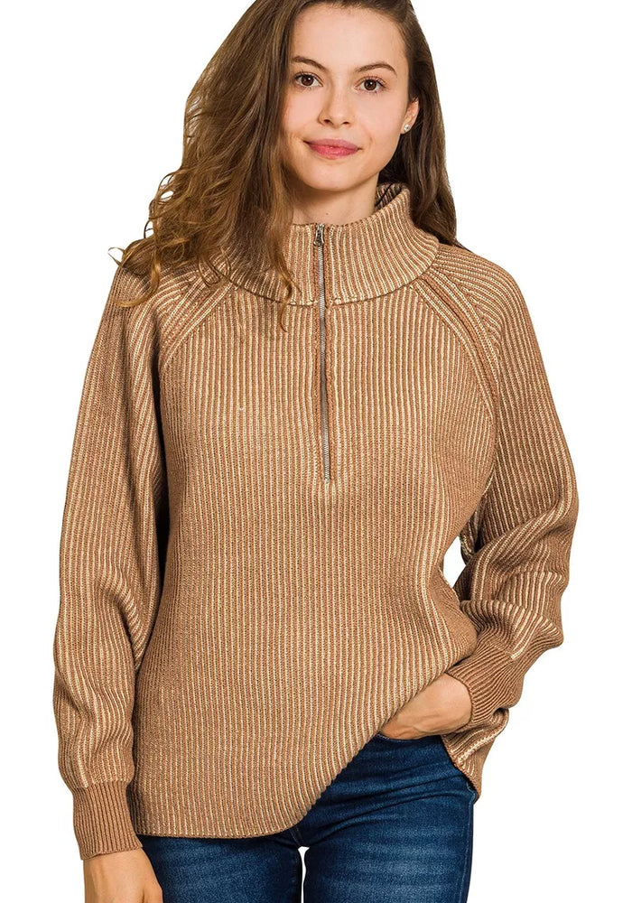 Zenana Ribbed Two Tone Half Zip Sweater