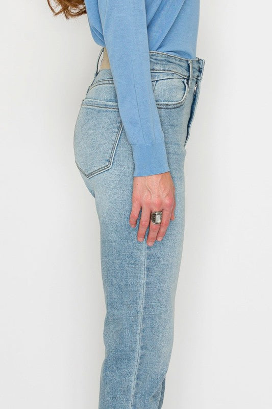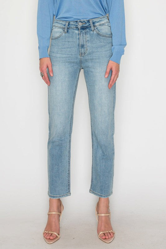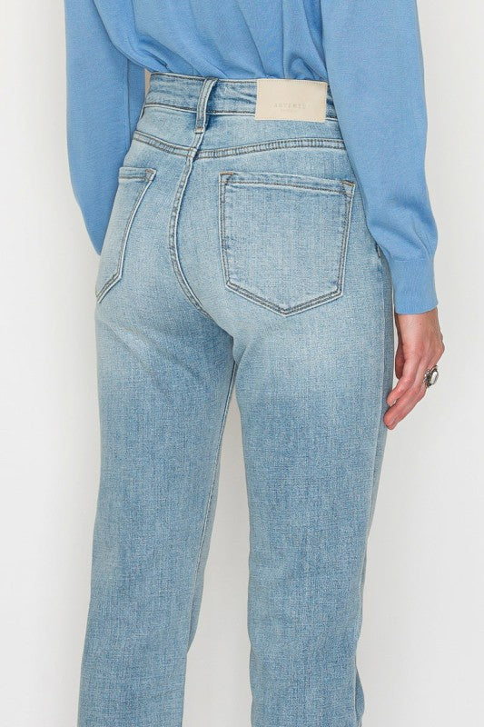 Meet the High Rise Slim Ankle Straight Jeans, designed for a sleek, elongated silhouette with everyday comfort. Crafted from premium stretch denim, this pair offers a flattering slim fit through the hips and thighs, finished with a straight ankle-length cut. The light stone wash adds a soft vintage tone, perfect for pairing with any look—from casual tees to structured blazers.
