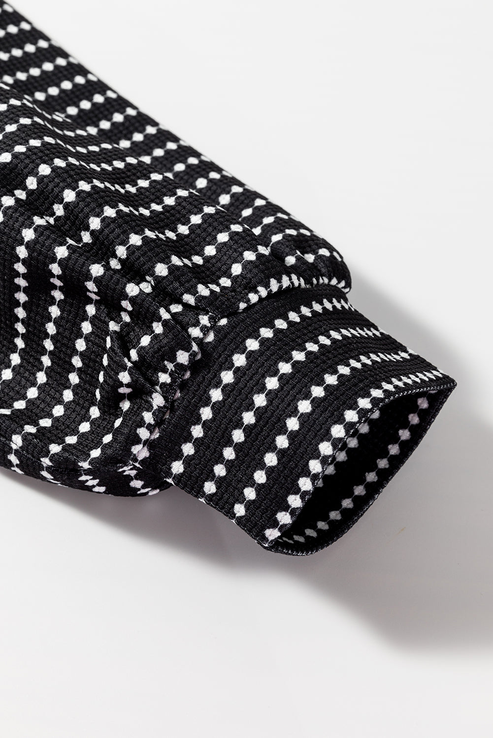 Flattering V neck and elegant puff sleeves enhance a graceful look.