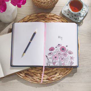 The deep blue faux leather cover of Bless Your Heart features a lovely garden of heat-debossed pink and white daisies, carnations, daffodils, and tulips. The title pops with a playful, gold-foiled font. A light pink ribbon marker complements the cover.