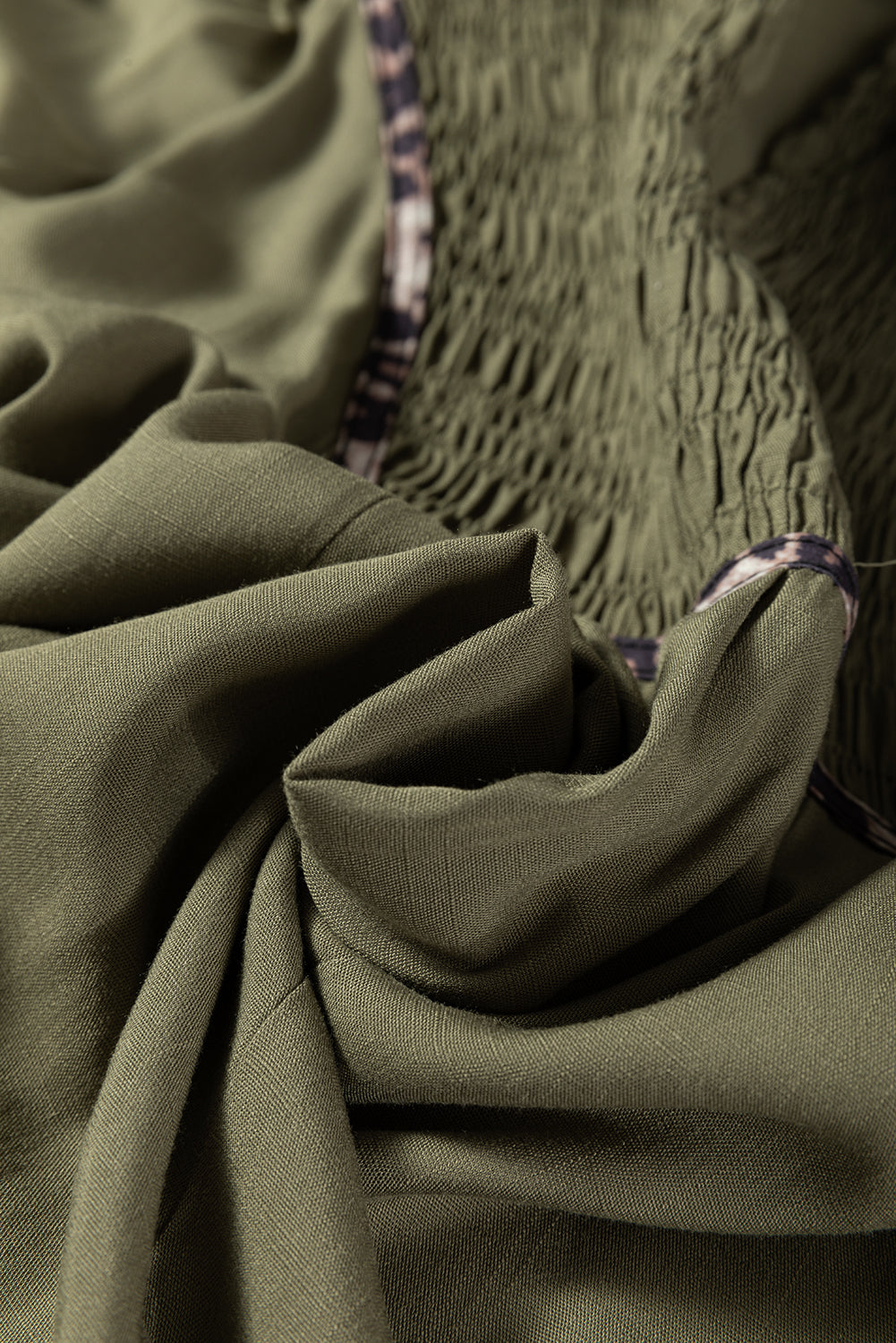 • Four Leaf Clover Collared V Neck Smocked Detail Contrast Leopard Trim Bracelet Sleeve Long Dress